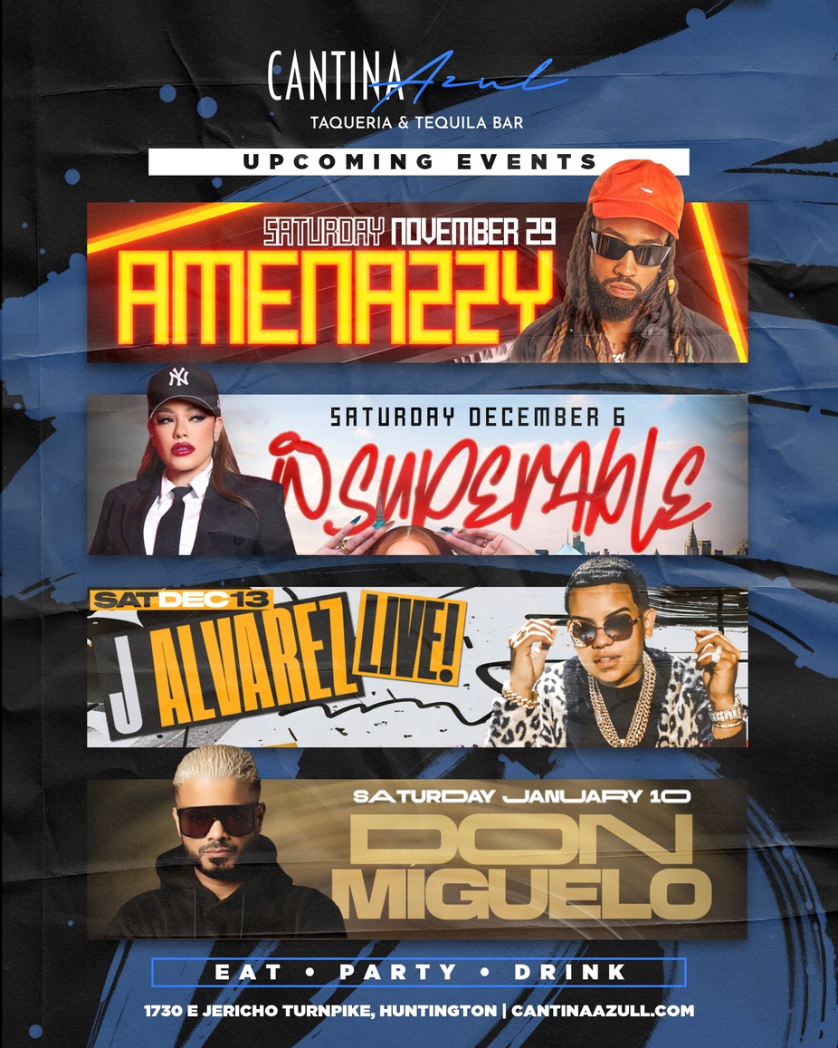 🕺 Save the dates and eat, party and drink with us for our upcoming events 💌 Dm for party and birthday packages 🥳Celebrate your birthday with us🔥Cantina Azul ⭐️ 11/29 @amenazzy 👠 12/6 @lainsuperable 🥳 12/13 @jalvarezoficial 💥 1/10 @donmiguelo